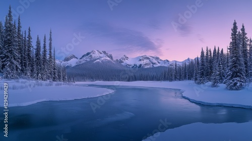 Serene winter landscape with snowy mountains and frozen lake at dusk