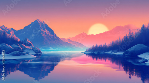 mountain, lake, sunset, winter, snow, sky, pink, blue, serene, calm, peaceful, tranquil, cold, frosty, icy, water, tree, forest, conifer, pine, landscape, scenery, nature, beautiful, picturesque, majestic, grand, towering, vibrant, colours, hue, shades, light, sun, horizon, stillness, quiet, solitude, artwork, digital, art