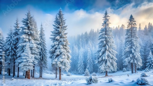 Serene Winter Wonderland Majestic Snow-Covered Evergreens in a Misty Forest, Bathed in the Soft Glow of Dawn