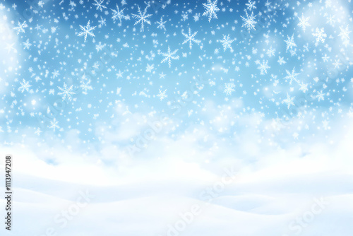 Serene winter wonderland scene; snowflakes falling on a snowy landscape under a clear blue sky. Perfect for holiday cards, winter backgrounds, or seasonal designs.