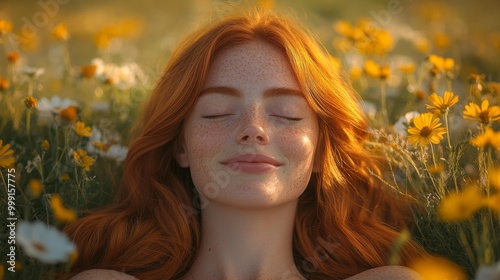 woman, red hair, freckle, flower, nature, serene, peaceful, beauty, sunlight, summer, meadow, happiness, calm, relaxation, portrait, face, skin, natural, spring, landscape, yellow flower, warm, content, blooming, floral, joyful, vibrant, harmony, human, soft light, delicate, outdoors, countryside, carefree, person, smile, 1, hair