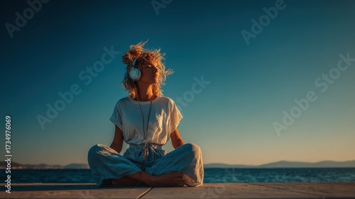 serene, woman, meditating, sea, yoga, relaxation, sunset, mindfulness, beach, ocean, wellness, lifestyle, peaceful, zen, calm, spiritual, nature, earphones, music, listening, exercise, health, fitness, balance, harmony, well-being, vacation, travel, coast, sunlight, gold, hours, leisure, activity, recreation, posture, lotus, position, blond