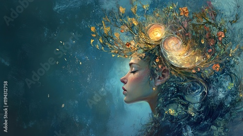 woman, portrait, face, hair, fantasy, art, artwork, digital, painting, illustration, girl, female, beautiful, nature, flower, leaf, plant, serene, peaceful, dreamy, mystical, magical, enchanted, glowing, light, gold, blue, green, teal, dark, profile, eye, closed, expression, emotion, feeling, spiritual, soulful, intricate, detailed, texture, abstract, creative, artistic, style, image, picture, design