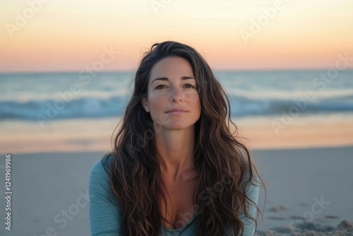 Serene woman with long brown hair sits on a beach at sunset, gazing calmly.