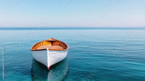 Serene Wooden Rowboat Floating on Calm Blue Water Under Clear Sky on a Peaceful Summer Day