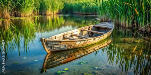 Serene wooden rowboat gently floats on tranquil waters, mirrored in the calm surface, surrounded by lush green reeds