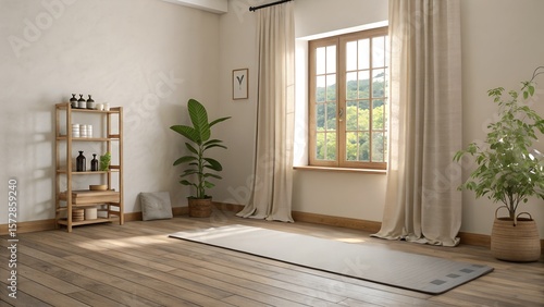 yoga, meditation, wellness, fitness, exercise, health, interior design, room, natural light, window, curtain, plant, greenery, wooden floor, bottle, tranquil, calm, peaceful, minimalist, modern, cosy, bright, airy, home decor, lifestyle, relaxation, studio, practice, indoor, serene
