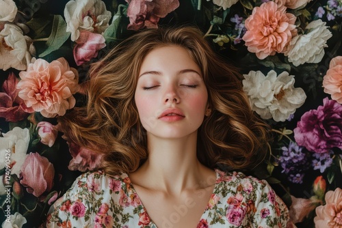 woman, girl, young, flower, floral, dress, peaceful, serene, tranquil, calm, beauty, romantic, dreamy, pastel, soft, brown hair, closed eyes, floral pattern, springtime, beautiful, feminine, delicate, portrait, model