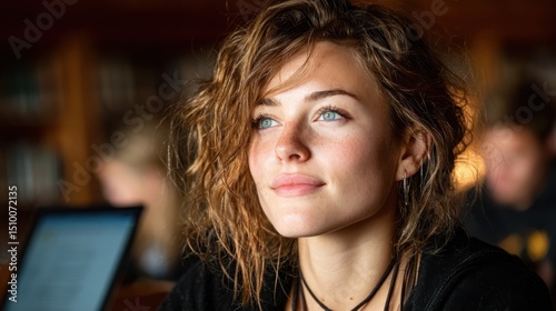 woman, young, wavy, hair, brown, eye, blue, green, gaze, serene, freckle, nose, cheek, charme, black, top, cord, neck, background, blurred, people, social, public, coffee, study, laptop, work, warm, lighting, cosy, inviting, atmosphere, natural, gentle, expression, striking, focal, point, setting, engaged, activity, modern, casual attire, relaxed, indoor, contemporary, sharpened, calm, thoughtful