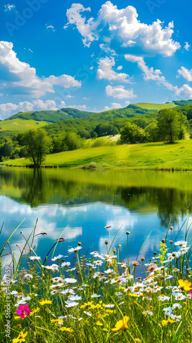 Serenity in Nature: A Tranquil Landscape of Rolling Hills, Reflective Lake, and Wildflowers