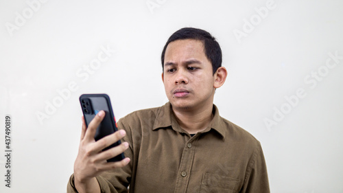 Serious and thoughtful face expression of young Asian Malay man looking at the smartphone.