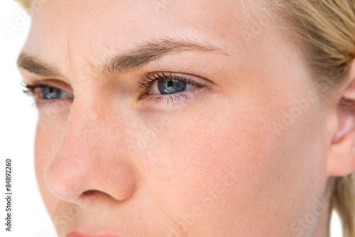 young adult, woman, female, caucasian, cut-out, isolated, blue eye, blond, closeup, serious, stern, unsmiling, frowning, white background
