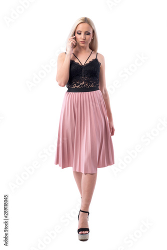 walking, woman, talking, young, on the phone, serious, worried, beautiful, isolated, mobile phone, fashion, full body, people, white background, blond, style, clothes, hair, skirt, pink, attractive, full-length, portrait, modern, lifestyle, femininity, elegance, youth, caucasian, platform, sandal, lace, salmon, fashionable, trendy, stylish, pretty, female, girl, high heel, phone, mobile phone, approaching, casual attire, looking down, multitask, listening, speaking, front view