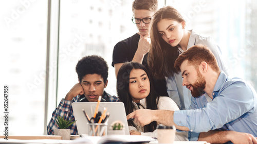 Serious college students in cooperation with their project at library using laptop