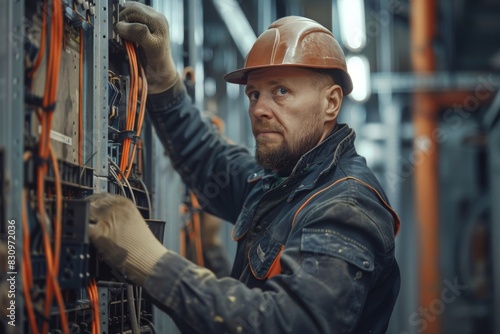Serious electrician with beard working on an industrial electrical panel