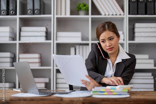Serious focused manager consulting client talking on the phone making business call at work, young female worker or customer speaking by mobile complaining on service or explaining solving problem