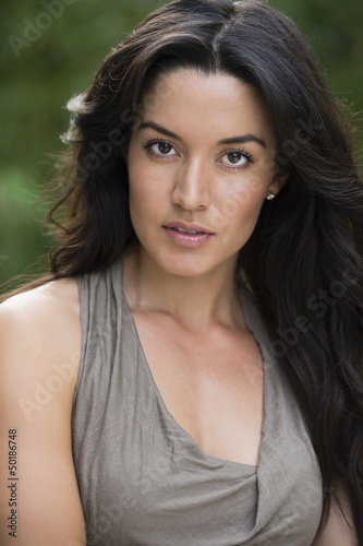 beauty, black hair, closeup, color image, confident, day, front view, glamour, latina, long hair, one person, outdoors, people, photo, portrait, posing, serious, vertical, woman, young adult, missy