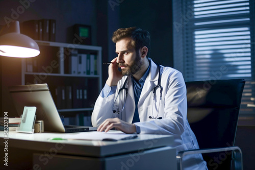 Serious male doctor is talking phone in clinic room, generative ai