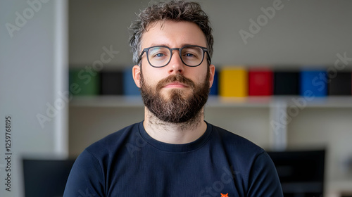 man, portrait, serious, office, home, bookshelf, background, book, goggles, beard, person, male, face, model, people, head shot, professional, business, confident, adult, expression, lifestyle, work, indoor, employee, men at work, executive, ceo, businessman, career, job, occupation, corporate, manager, leader, team, success, ambition, achievement, sharpened, determination, goal, future, vision, strategy