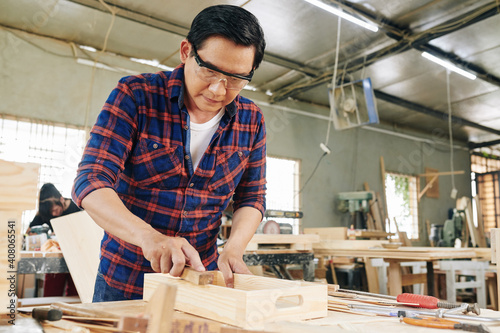Serious mature carpenter in goggles polishing drawer with wooden block