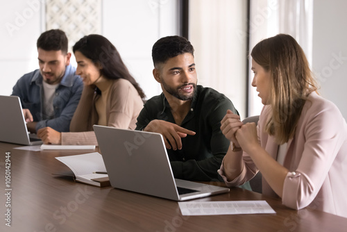 Serious young Arabic mentor training intern at laptop, speaking to coworker woman, explaining work task. Two multiethnic business colleagues talking at table, discussing corporate communication
