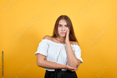 Serious young woman looking at camera, keeping hand on cheek isolated on orange background in studio in casual white shirt. People sincere emotions, lifestyle concept.