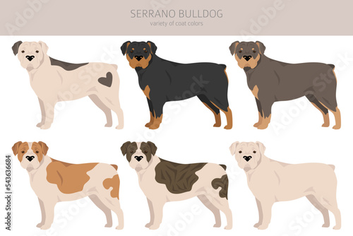 Serrano Bulldog clipart. All coat colors set. All dog breeds characteristics infographic