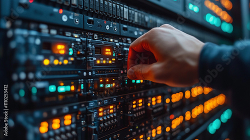 server racks in a data center with blurred background symbolizing technology, data processing, and the backbone of modern information infrastructure