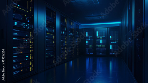 Server racks in computer network security server room data center 3D render dark blue. 3d waiter