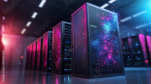 server, rack, datum, center, network, connection, glow, light, pink, blue, technology, infrastructure, digital, computing, cloud, cyberspace, storage, hardware, system, processing, information, communication, power, electricity, cable, wire, high, performance, modern, futuristic, advanced, security, safety, room, dark, floor, perspective