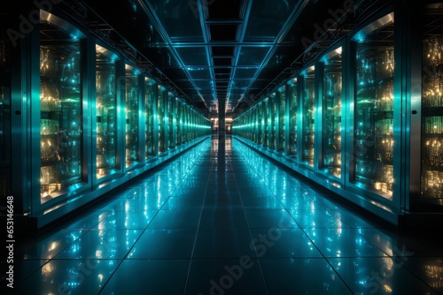 Server room with rows of servers casting a cool blue glow, Generative AI