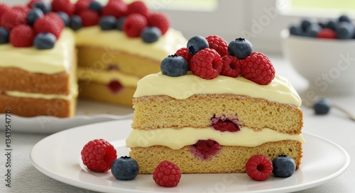 cake, slicing, serving, dessert, berry, raspberry, blueberry, frosting, cream, cheese, layer, baking, food, sweet, plate, eating, celebration, ingredient, table, window, closeup, still life, fresh, homemade, nourishment, delicious, refreshment, lifestyle, cooking, snack, tasty, white, bakery, dish, fruit, diet, indoor, arrangement, lunch