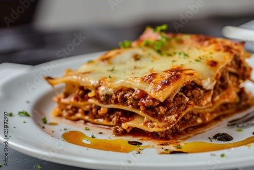 Serving of lasagna bolognese with melted cheese and parsley topping on a white plate, ready to be enjoyed