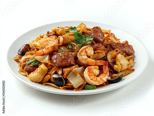 asian cuisine, dish, seafood, meat, plate, serving, meal, food, cookery, noodle, shrimp, clam, sausage, vegetable, cilantro, scallion, closeup, studio shot, white background, fresh, tasty, delicious, cooked, cooking, lunch, dinner, epicure, eatery, traditional, culture, southeast asia, malaysia, singapore, culinary, asian cuisine, food photography
