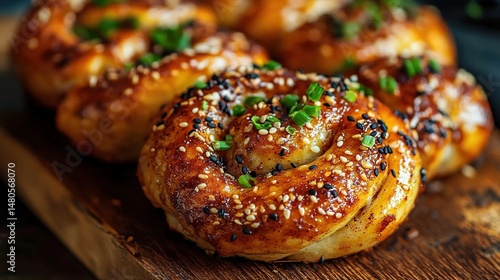 sesame seeds, green onion, bread, pastry, baked goods, wooden board, food, garnish, golden brown, crispy