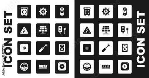 Set Battery charge, Solar energy panel, High voltage, Washer, Electric extension, Gear and lightning, Music player and Ohmmeter icon. Vector
