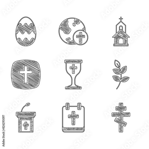 Set Christian chalice, Calendar with Easter, cross, Willow leaf, Church sermon tribune, building and egg icon. Vector