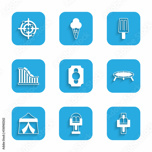 Set Circus ticket, Attraction carousel, Jumping trampoline, tent, Roller coaster, Ice cream and Target sport icon. Vector
