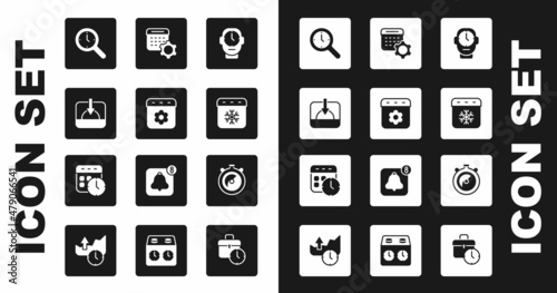 Set Clock, Calendar spring, Sunset, Magnifying glass with clock, winter, settings, Stopwatch and and icon. Vector