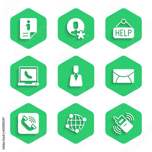 Set Employee, Global technology, Mobile phone, Mail and e-mail, Telephone handset, 24 hours support, Signboard with text Help and Information icon. Vector