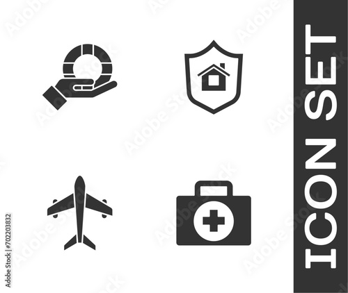 Set First aid kit, Lifebuoy in hand, Plane and House with shield icon. Vector