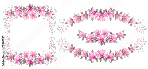 Set floral spring frame. Hand drawn painting watercolor pencils and paints pink magnolia flowers isolated on white. Wedding frame.