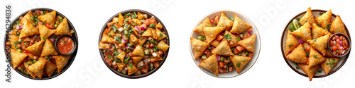 Set, group, collection of A plate of samosa Chaat top view isolated on transparent background.
