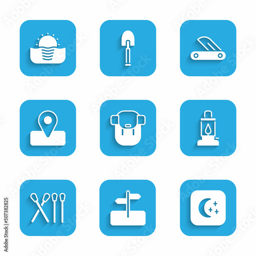 Set Hiking backpack, Road traffic sign, Moon and stars, Camping lantern, Match stick, Location for camping, Swiss army knife and Sunrise icon. Vector