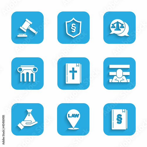 Set Holy bible book, Location law, Law, Prisoner, Bribe money bag, pillar, Scales of justice and Judge gavel icon. Vector