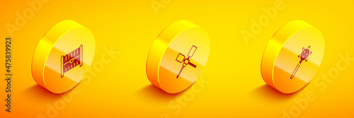 Set Isometric Antique treasure chest, Oars or paddles boat and Mace with spikes icon. Vector