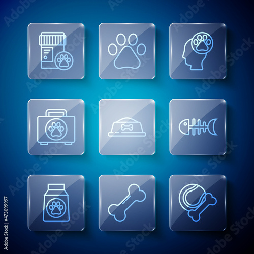 Set line Bag of food, Dog bone, Pet toys rubber and ball, Human with animals footprint, bowl, first aid kit, medicine bottle and Fish skeleton icon. Vector