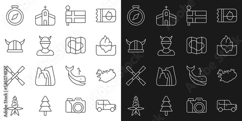 Set line Car, Map of Iceland, Iceberg, Flag, Viking head, horned helmet, Compass and icon. Vector