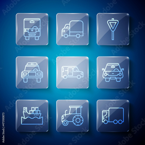 Set line Cargo ship with boxes, Tractor, Delivery cargo truck, Road traffic signpost, Minibus, Police and flasher, Bus and icon. Vector