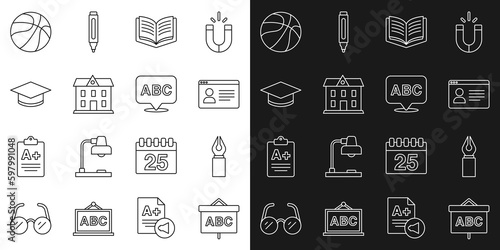 Set line Chalkboard, Fountain pen nib, Online class, Open book, School building, Graduation cap, Basketball ball and Alphabet icon. Vector